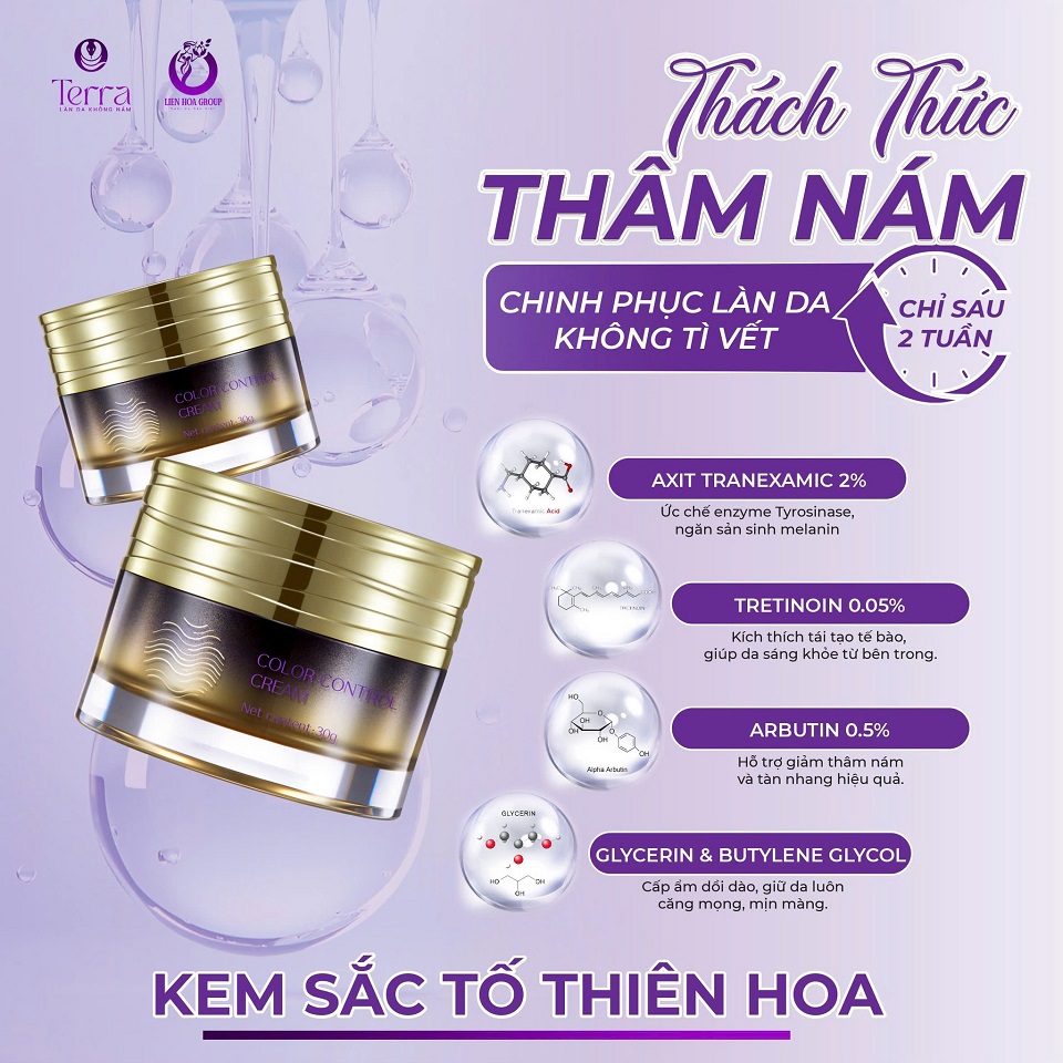 Với chiết xuất từ các tinh chất tinh túy đến từ thiên nhiên, Kem sắc tố Thiên Hoa hứa hẹn trả lại cho phụ nữ Việt những gương mặt tự tin, rạng ngời không còn vết Nám. Từng thành phần trong Siêu phẩm mang lại những công dụng hữu hiệu tuyệt vời cho làn da nàng!