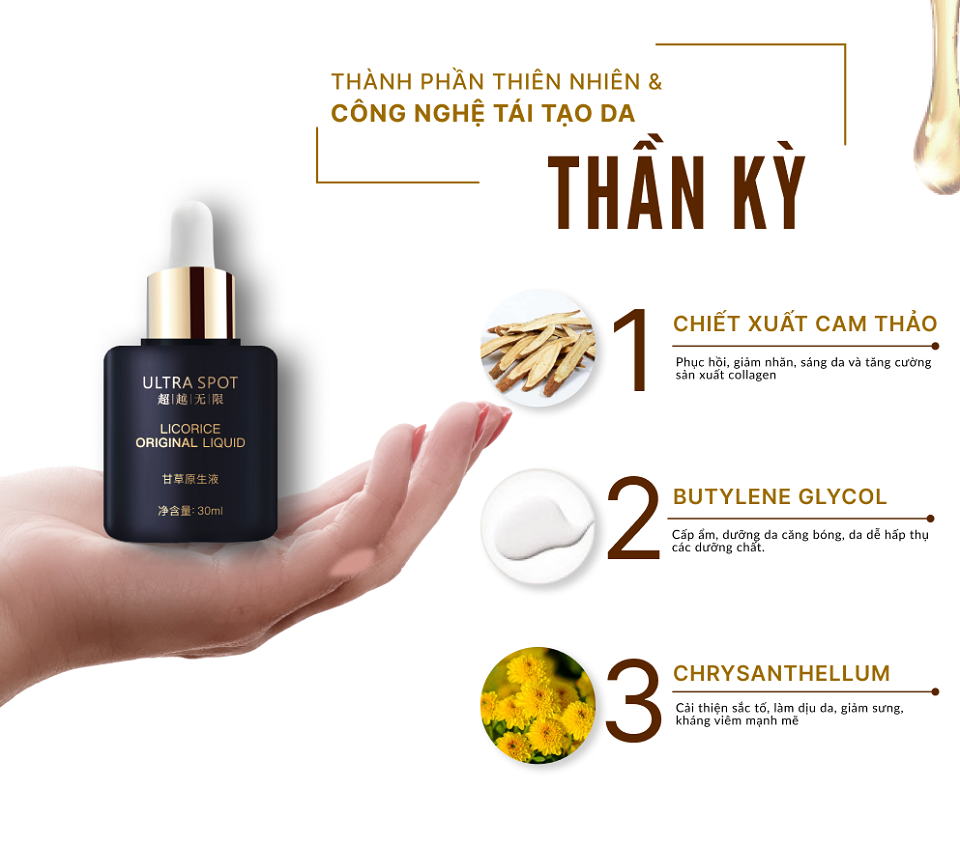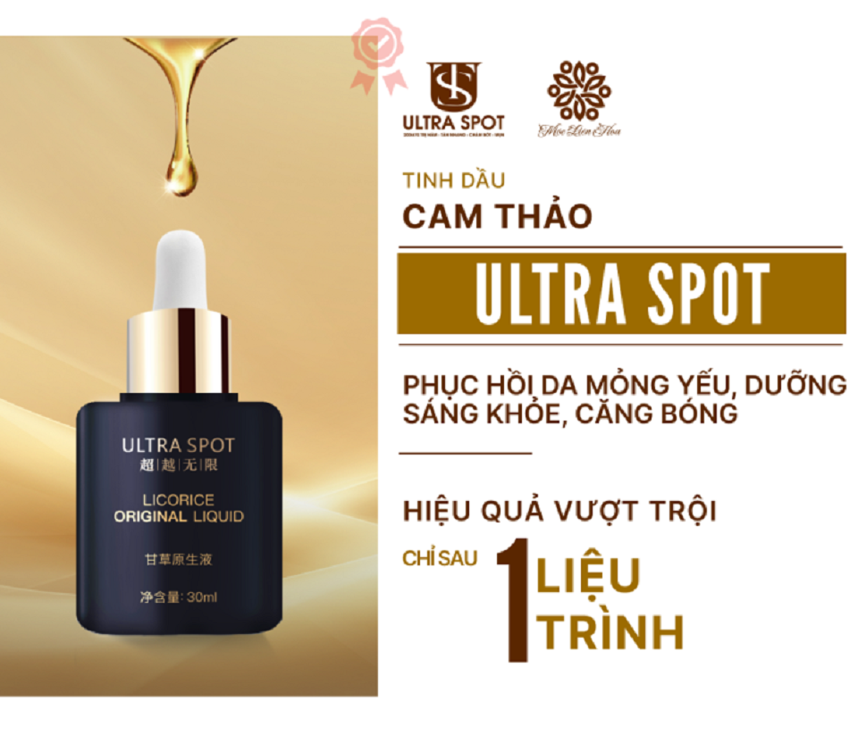 TINH DẦU CAM THẢO ULTRA SPOT Licorice Original Liquid Chuyên Phục Hồi Da Mỏng Yếu Lộ Mao Mạch - Làm Dày và Khỏe Da Sản phẩm của Ultra Spot Hồng Kông Thể tích: 30ml Mã vạch: 6941545107257 4897111391181 4897136430735 Giá lẻ: 1.200.000đ/Chai