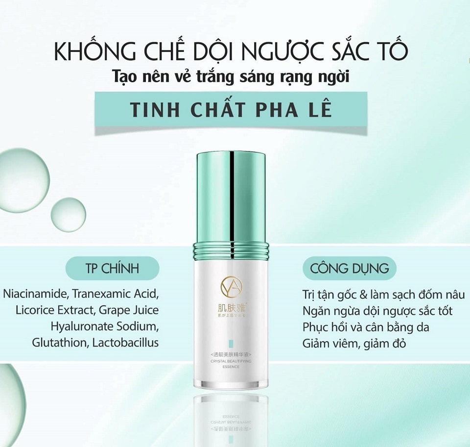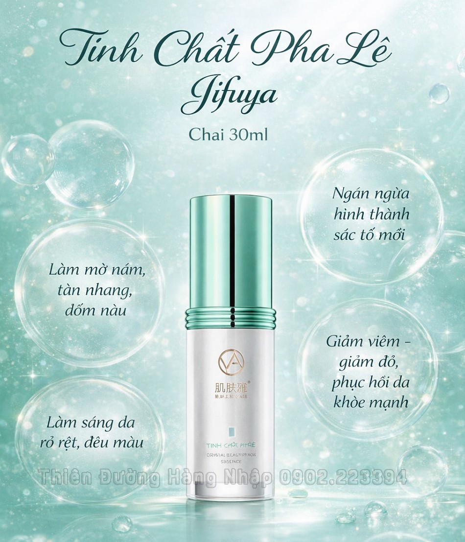 => Với sự kết hợp đặc biệt giữa công thức độc quyền và các dưỡng chất quan trọng. Tinh chất pha lê giúp trắng sáng da vượt trội, cấp ẩm mềm da, se khít lỗ chân lông. Kích thích sản sinh collagen, phối hợp với kem khống chế sắc tố. - Tinh chất pha lê JIFUYA được sản xuất dành riêng cho những làn da bị tổn thương do nám đến từ thương hiệu JIFUYA ( Hong Kong) - Sản phẩm này giúp da đều màu, làm mờ vết nám và những tạp chất còn lưu lại. Tinh chất có thiết kế dạng lỏng nhẹ, rất dễ dàng thẩm thấu vào sâu trong các tầng da. - Tinh chất pha lê không chỉ làm trắng sáng da mà còn giúp cân bằng và đồng đều tông màu da. Chưa dừng lại ở đó, sản phẩm này còn cung cấp một loạt các lợi ích đặc biệt như làm mềm da. Cải thiện tình trạng da khô, se khít lỗ chân lông. Đặc biệt, giúp tăng độ đàn hồi và làm dịu da mà không hề gây kích ứng. - Tinh chất Pha Lê mang lại rất nhiều công dụng cho da. Đặc biệt là những làn da bị ảnh hưởng của nám và thâm nám. Làm trắng sáng da , bật tông và đồng đều màu da. Cấp ẩm mềm da, bảo vệ da. Cải thiện tình trạng da thô ráp và khô. Se khít lỗ chân lông. Tăng độ đàn hồi của da. Kích thích sản sinh collagen. Làm dịu da, không gây đỏ hay kích ứng Giúp làn da mịn màng, căng bóng
