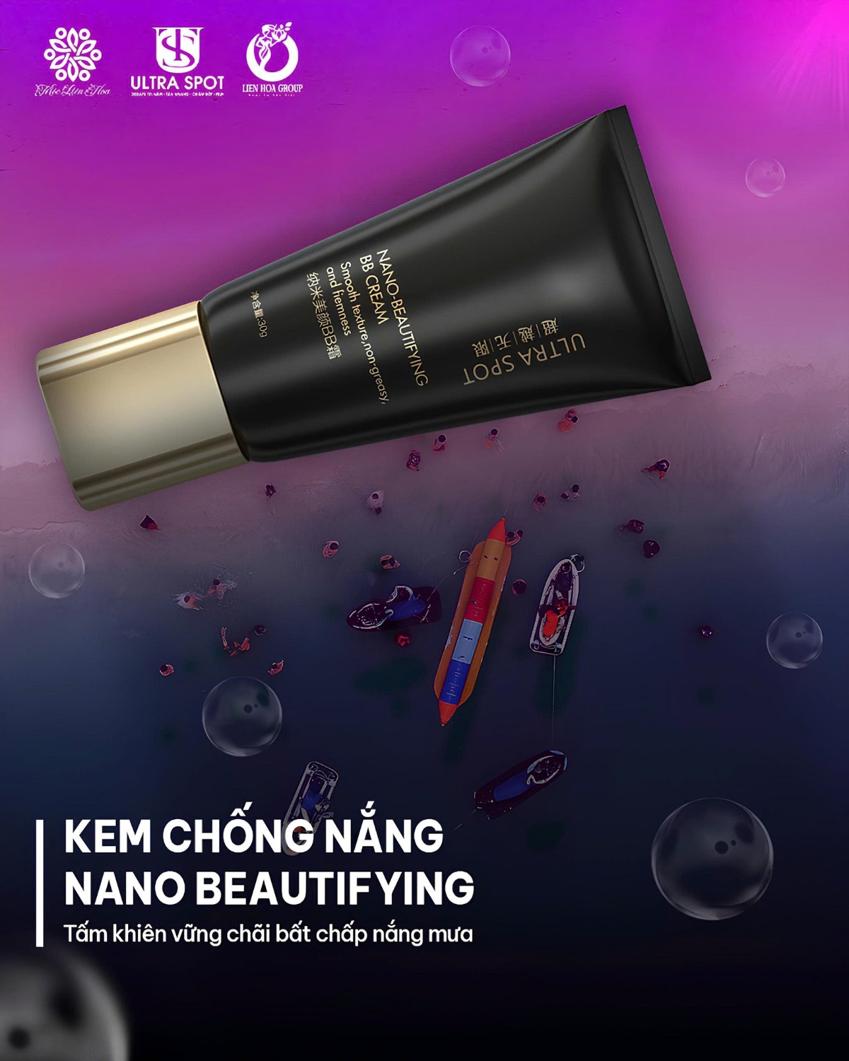 Kem Chống Nắng BB Cream Nano của thương hiệu mỹ phẩm ULTRA SPOT với tính năng 3 trong 1, phát huy 3 khả năng tác động chỉ trong một sản phẩm. Kem chống nắng BB Cream Nano vừa có tác dụng vật lý ngăn chặn sự tác động của tia UVA/UVB trên làn da, vừa có tác dụng hóa học tạo nên phản ứng hòa tan các tác nhân của tia bức xạ từ ánh nắng mặt trời. Với chỉ số SPF 50 vừa phải và chỉ số PA+++ hoàn toàn có thể bảo vệ làn da trong suốt thời gian dài lên đến 8 giờ liên tục. Sản phẩm hoàn toàn không thấm nước lại lên màu da như lớp kem nền, vừa bảo vệ da vừa làm đẹp.