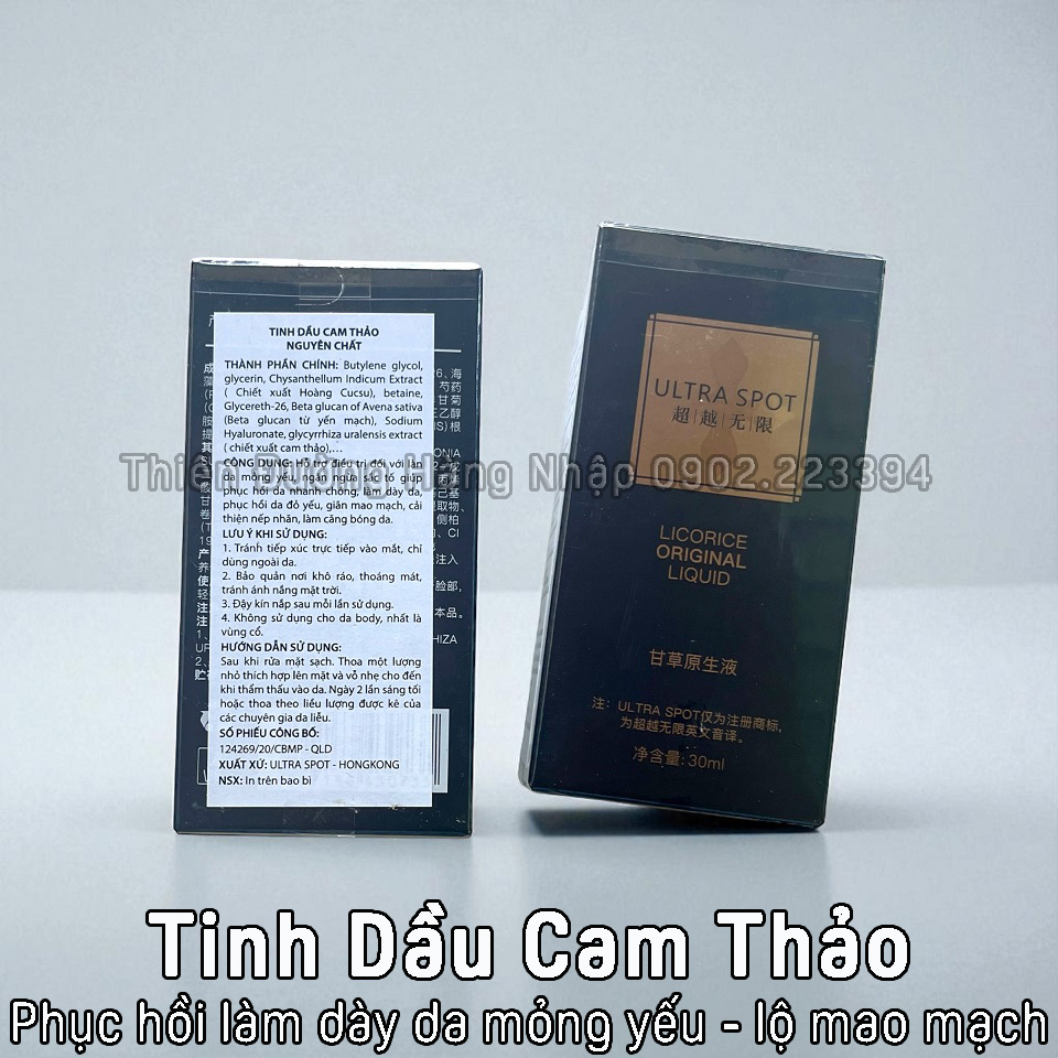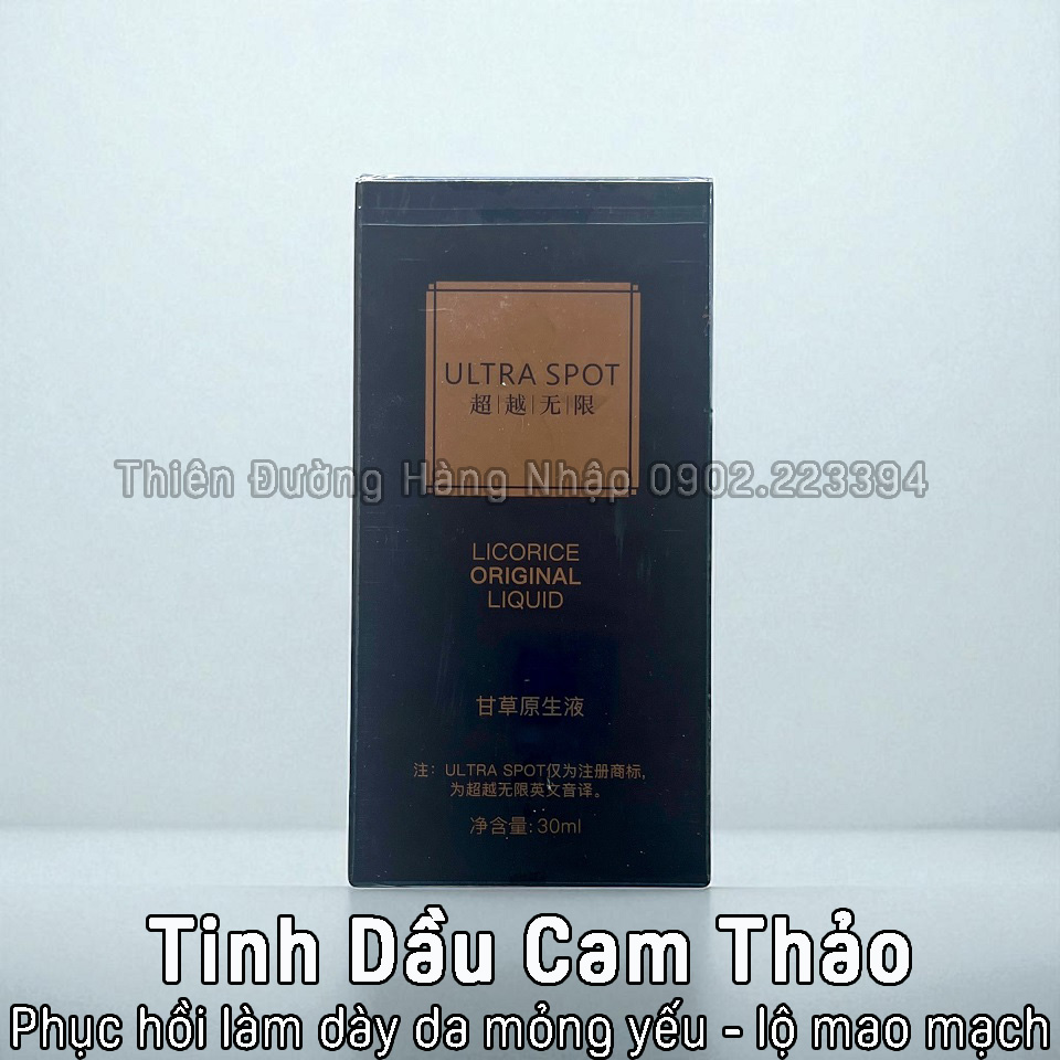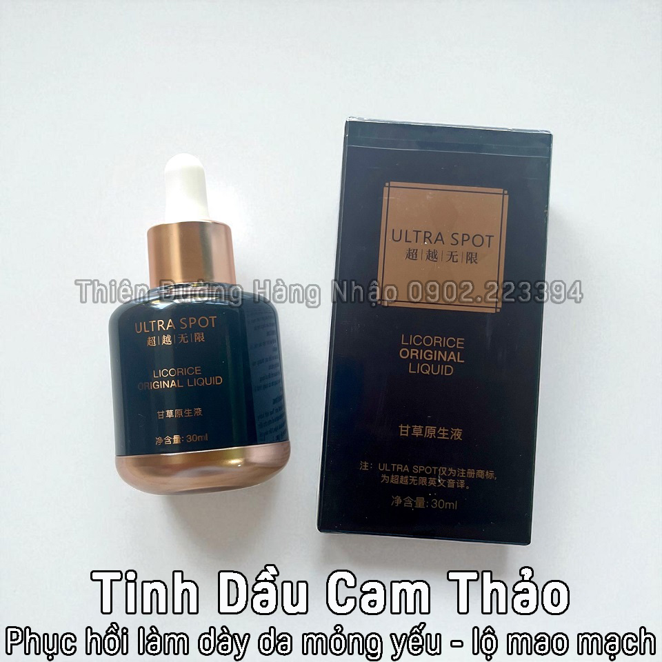 TINH DẦU CAM THẢO ULTRA SPOT Licorice Original Liquid Chuyên Phục Hồi Da Mỏng Yếu Lộ Mao Mạch - Làm Dày và Khỏe Da Sản phẩm của Ultra Spot Hồng Kông Thể tích: 30ml Mã vạch: 6941545107257 4897111391181 4897136430735 Giá lẻ: 1.200.000đ/Chai